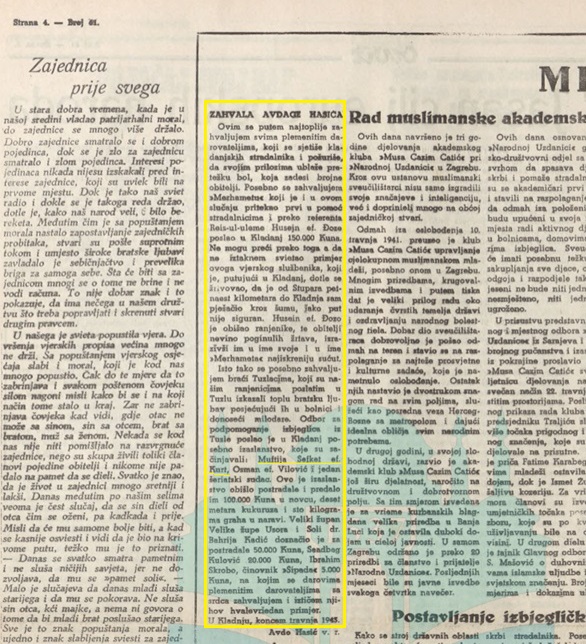 За ове двије посјете Авдага Хусић се посебно захвалио Хусеину ефендији Ђозу и Шефкету ефендији Курту у сарајевским новинама Освит, које су штампaне у периоду од 1942 – 1944. године.