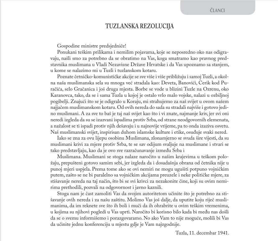 Да је муслимански народ Тузле био узнемирен показује и Тузланска резолуција, донесена, након ових догађаја, 11. децембра 1942. године од стране угледних муслимана Тузле (претпоставка је да је један од потписника био и ефендија Курт ). У овој резолуцији муслимански народ обраћа се властима НДХ јер се „познате четничко – комунистике акције све више и више приближавају самој Тузли, а околна наша муслиманска села су већ страдала…“. Овај документ данас се покушава приказати као кључни доказ муслиманског антифашизма и доброте муслиманског народа јер се у њему наводно тражи заустављање злочина над Србијма и Јеврејима (који се у резолуцији и не помињу). Читањем текста јасно се види да се муслимански народ Тузле плаши четника и комуниста и себе ставља у први план односно траже да они буду заштићени при томе признајући да неки елементи муслиманског народа ипак чине злочине над Србима.
